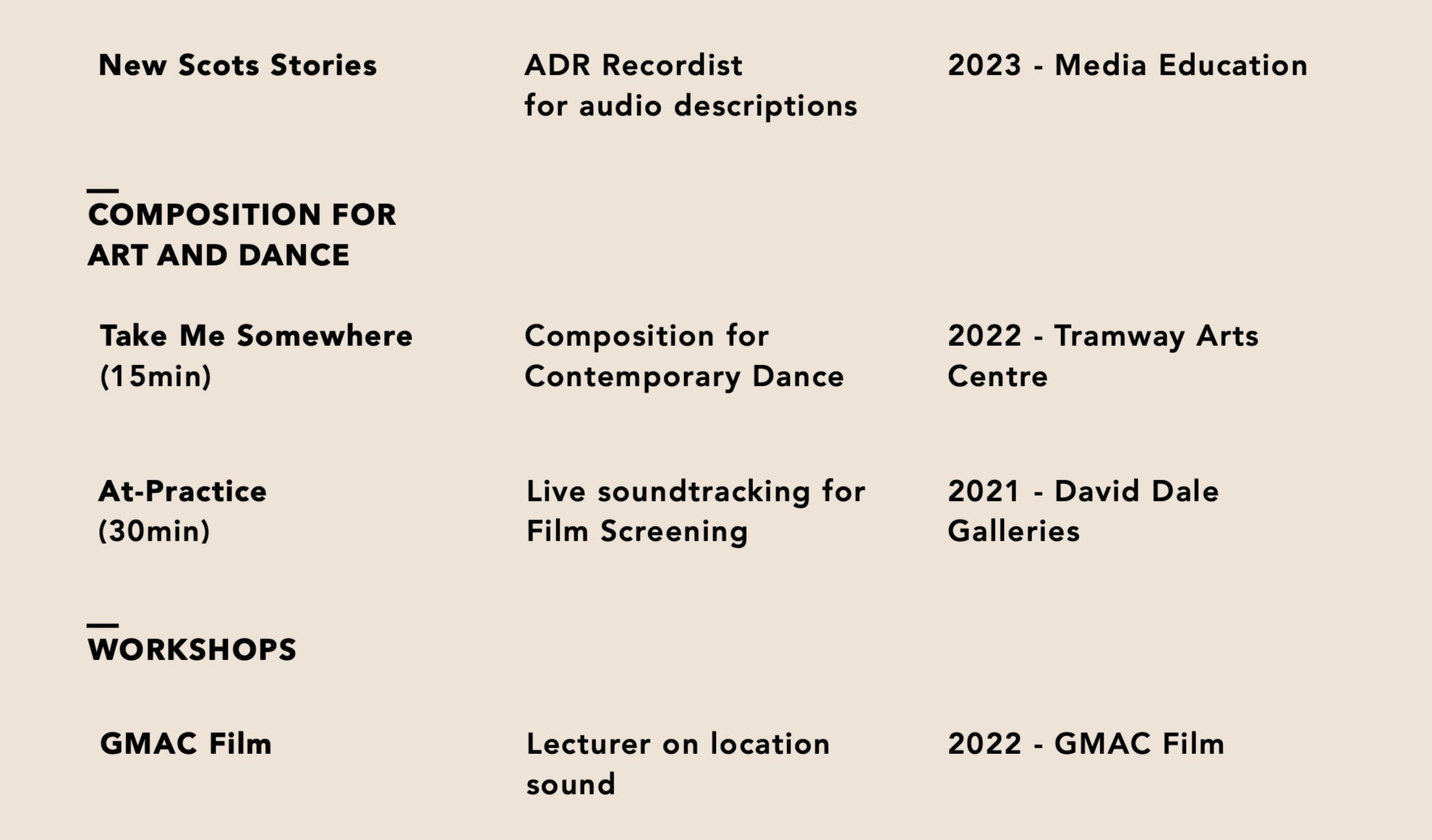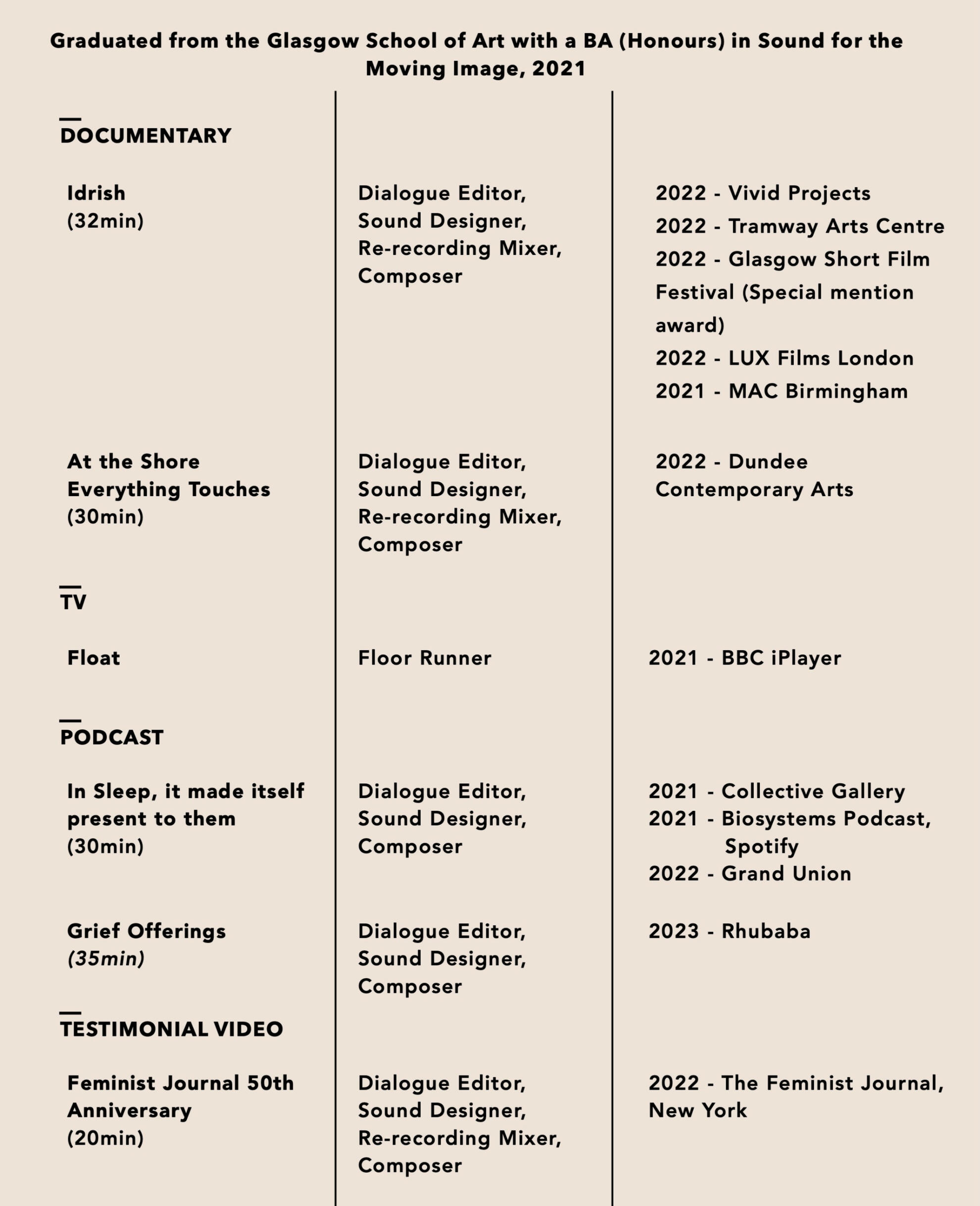 An audio producer, sound designer and composer currently based in the UK, originally from New York.I received a degree in Sound for the Moving Image with honours at Glasgow School of Art in 2021.